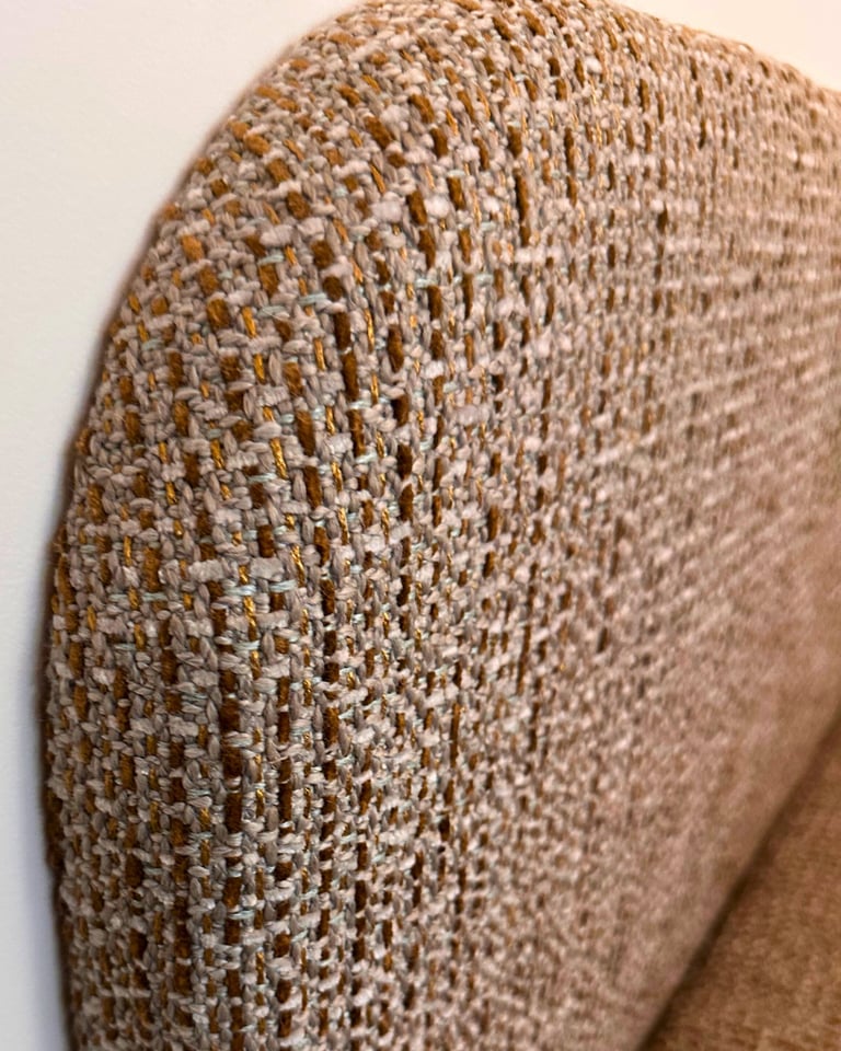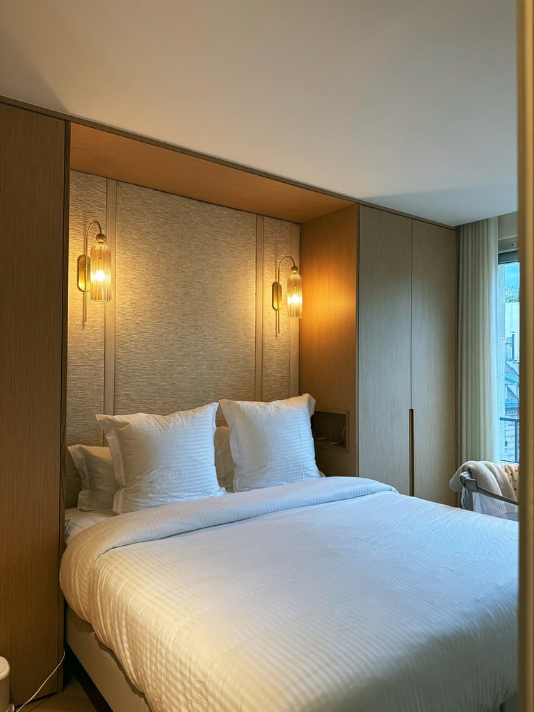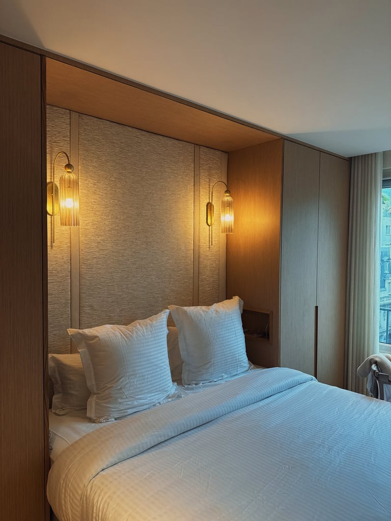 Panneau tapissé et frise sculptée sur mesure pour créer un fond élégant et harmonieux, en parfaite continuité avec le mobilier.