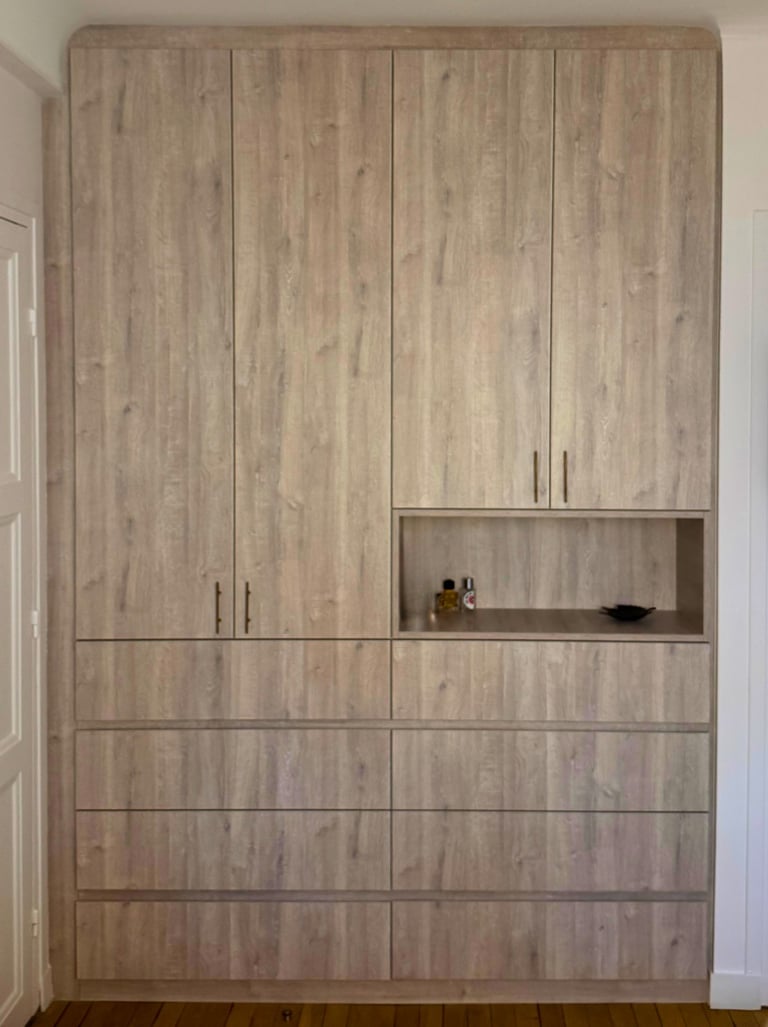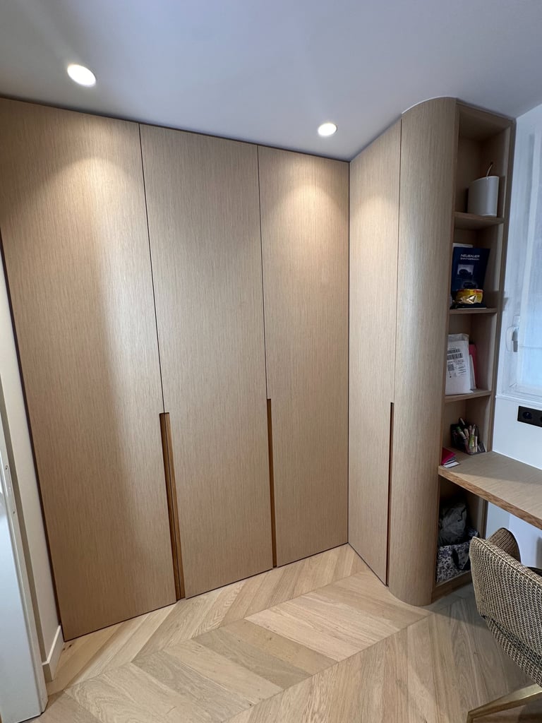 Ces trois réalisations illustrent l’ingéniosité du sur-mesure pour optimiser chaque espace. Des placards parfaitement intégrés autour des volumes existants, des rangements qui épousent colonnes et poutres, et des finitions sobres et élégantes qui s’adaptent à tous les styles d’intérieur. Bois clair, blanc ou combinaison des deux : chaque détail est pensé pour allier esthétisme, fonctionnalité et durabilité.