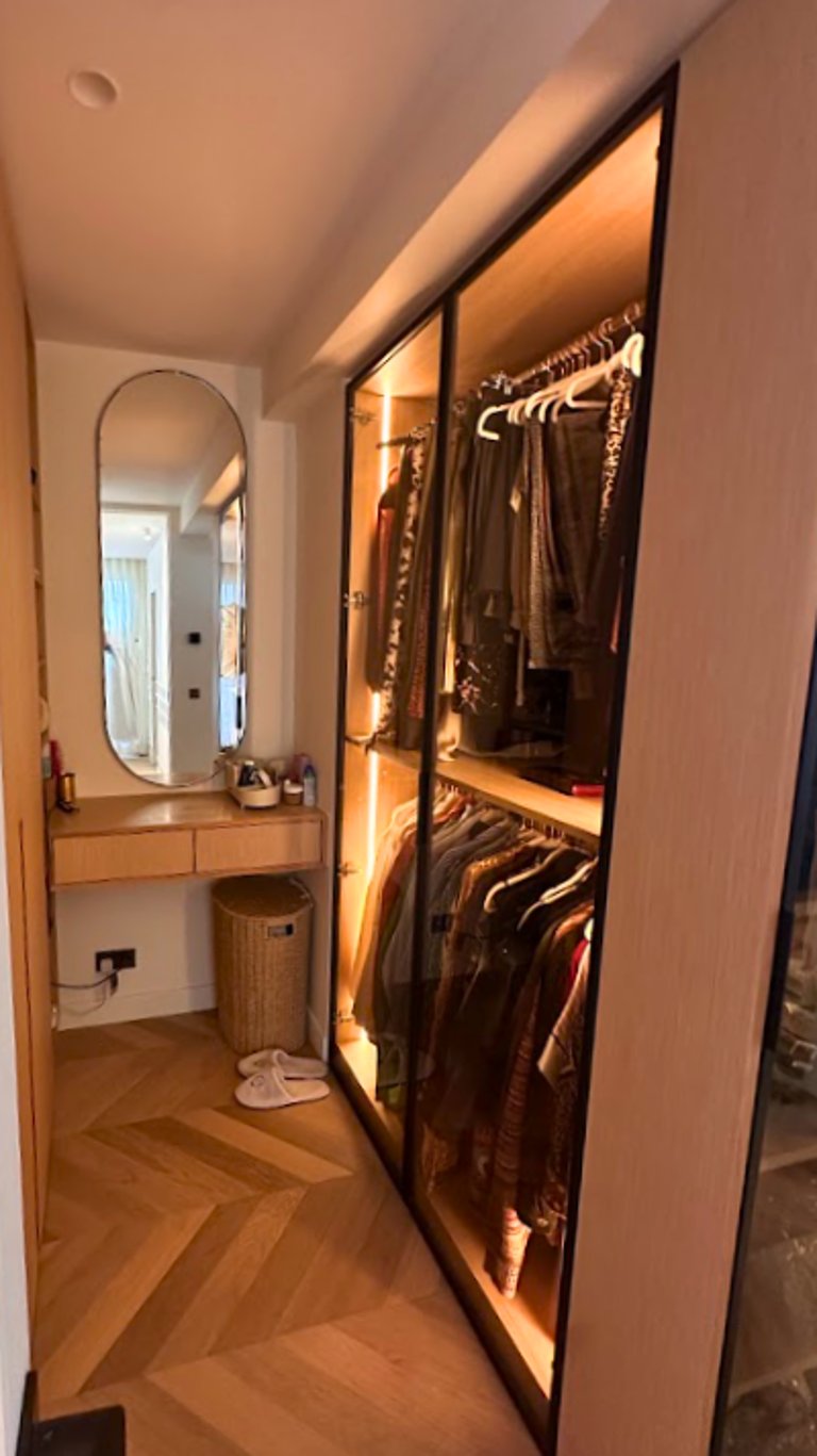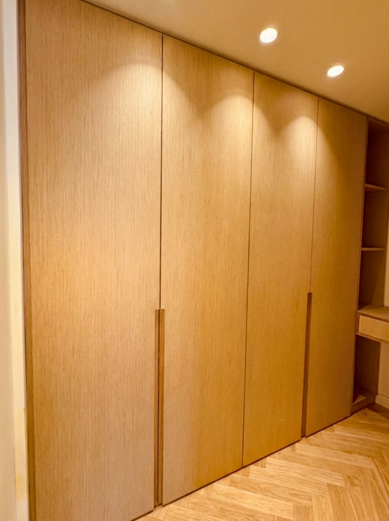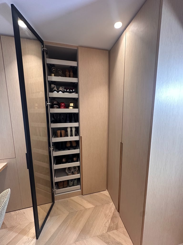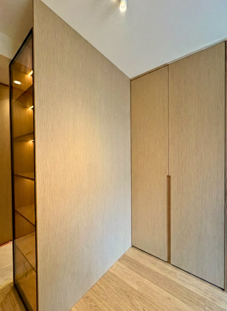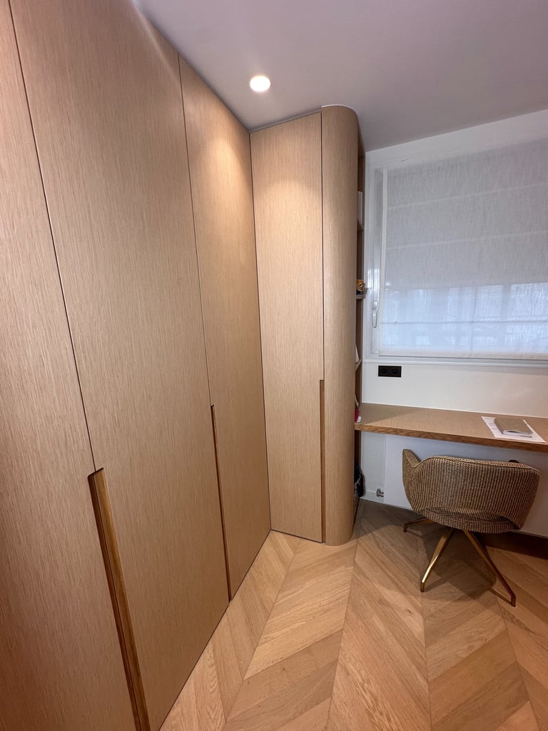 AR STYLE a conçu des placards et dressings sur mesure en bois clair avec finitions sobres et poignées travaillées. Chaque meuble intègre des aménagements intérieurs optimisés : penderies, tiroirs, étagères et niches de rangement. L’éclairage LED intégré met en valeur les espaces tout en facilitant l’utilisation au quotidien. Cet agencement moderne et fonctionnel apporte à la fois confort, organisation et esthétique à la chambre comme à l’entrée.