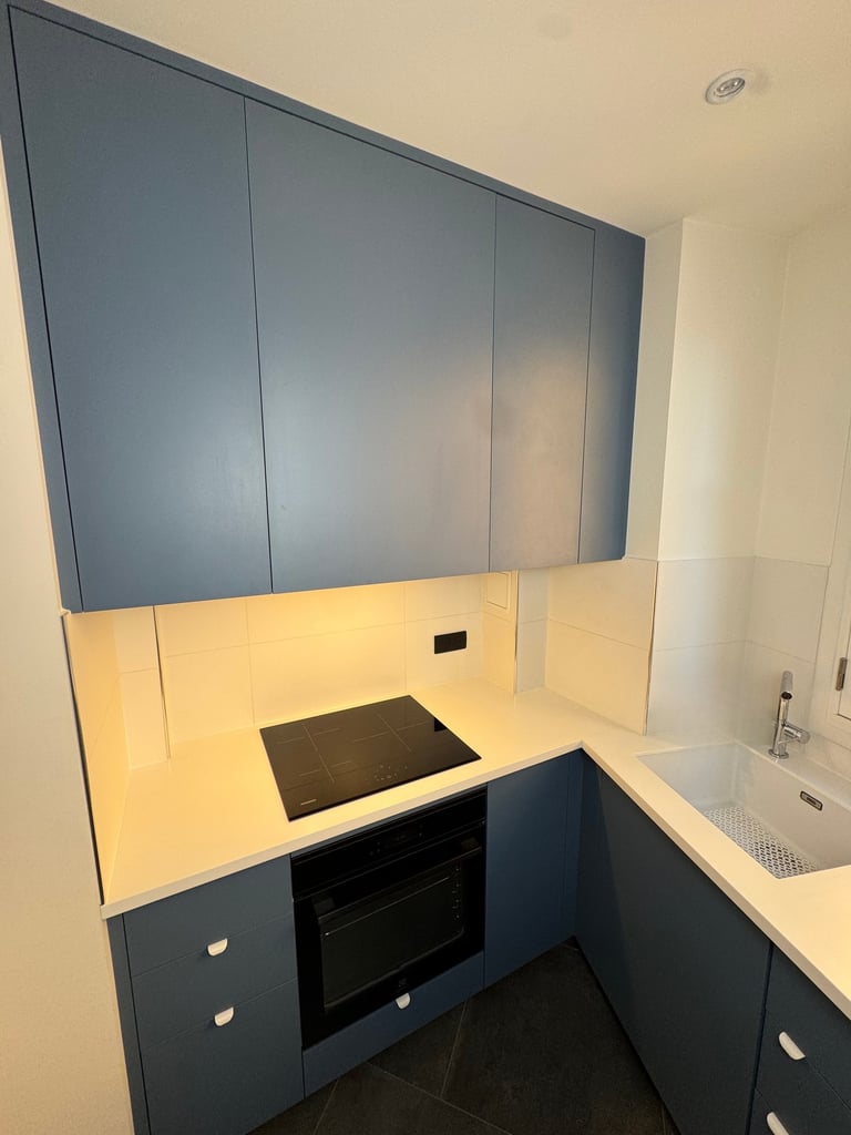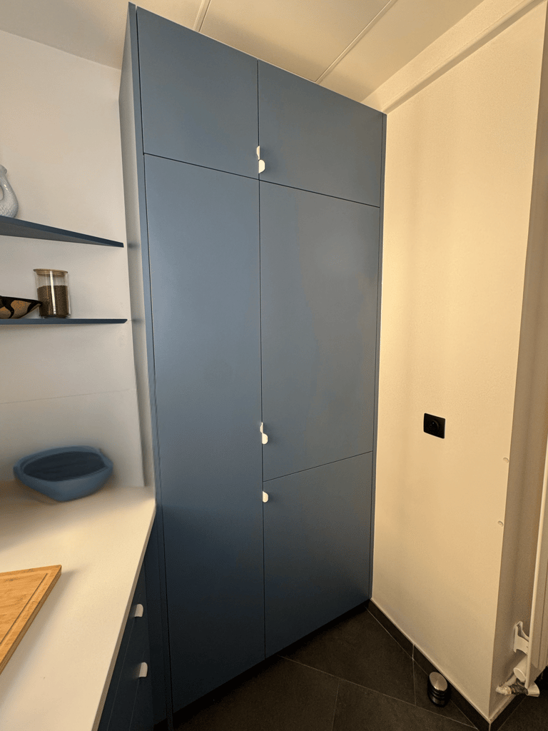 Façades bleu mat, plan de travail clair et rangements intégrés optimisent l’espace.