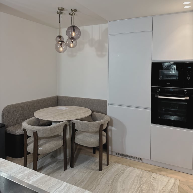 Implantation épurée en façades laquées blanches et bois foncé, électroménager intégré et banquette d’angle sur mesure pour un espace repas chaleureux et optimisé.