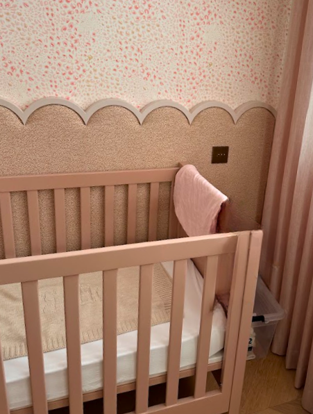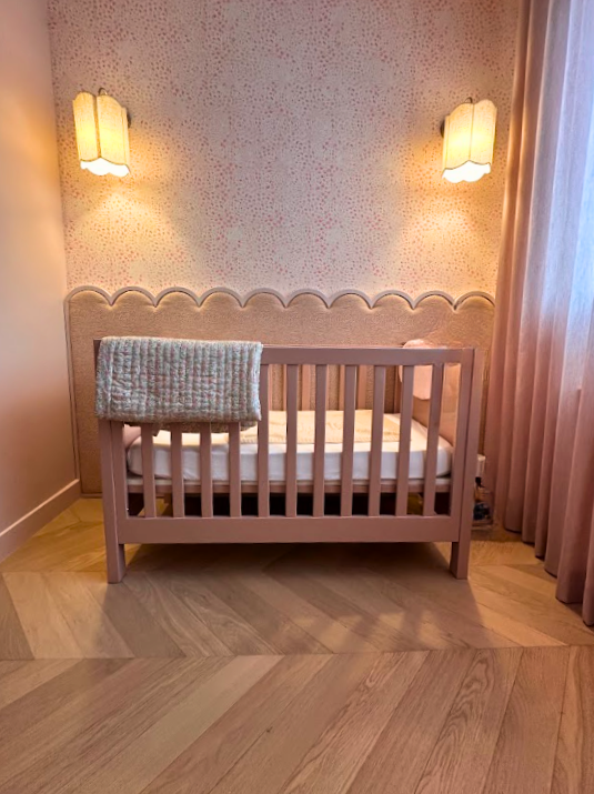 Lit bébé sur mesure en bois laqué rose poudré - Habillage mural décoratif avec frise arrondie